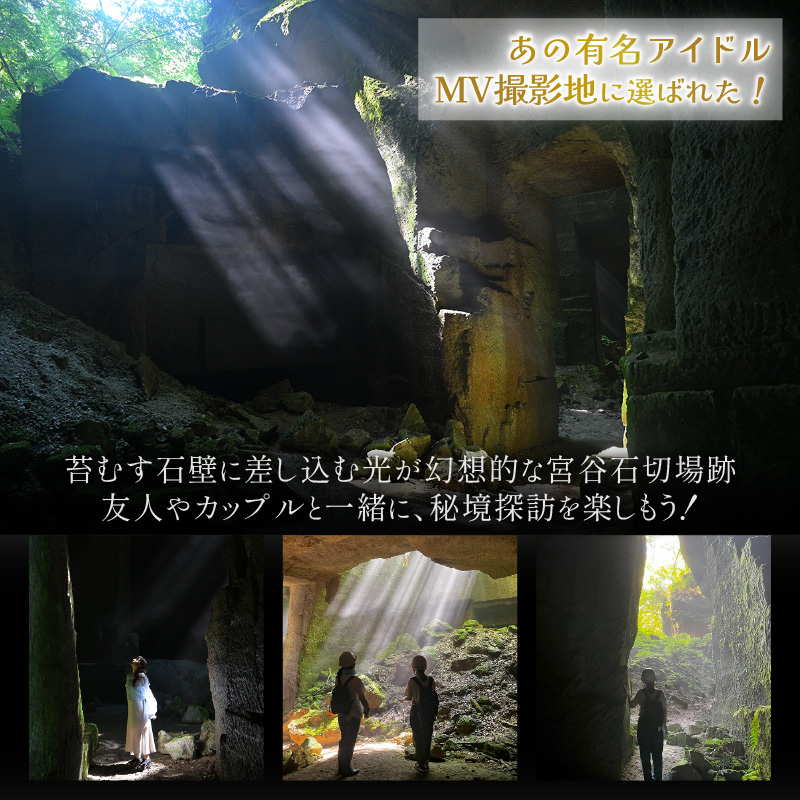 有名アイドルグループのミュージックビデオのロケ地として選定された、苔むす石壁に差し込む光が幻想的な宮谷石切場跡。友人やカップルと一緒に、秘境探訪を楽しもう!