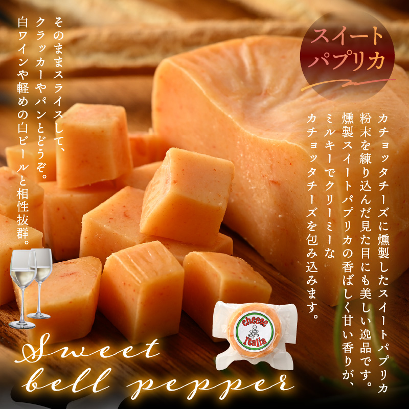 カチョッタチーズに燻製したスイートパプリカ粉末を練り込んだ見た目にも美しい逸品です。燻製スイートパプリカの香ばしく甘い香りが、ミルキーでクリーミーなカチョッタチーズを包み込み、口の中で香りのグラデーションが広がります。そのままスライスして、クラッカーやパンとどうぞ。白ワインや軽めの白ビールと相性抜群。香りとコクが互いを引き立て合います。この一口で、ミルキーさと燻香の旅へ。ぜひお試しください。