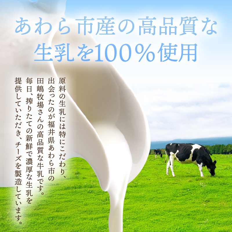 原料の生乳には特にこだわり、出会ったのが福井県あわら市の田嶋牧場さんの高品質な牛乳です。毎日、搾りたての新鮮で濃厚な生乳を提供していただき、チーズを製造しています。
