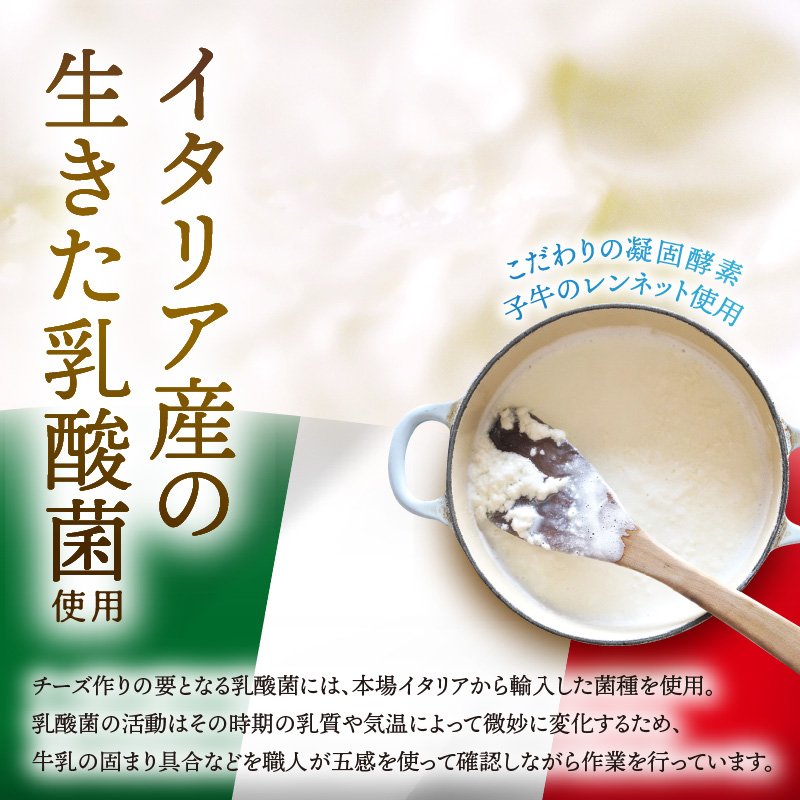 チーズ作りの要となる乳酸菌には、本場イタリアから輸入した菌種を使用しています。乳酸菌の活動はその時期の乳質や気温によって微妙に変化するため、牛乳の固まり具合などを職人が五感を使って確認しながら作業を行っています。