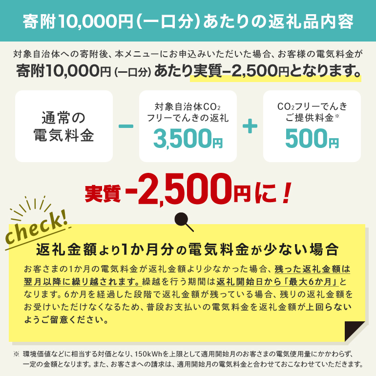 ※2 寄附10,000円(1口分)につき、後述の申込み条件を満たす方を対象に、3,000円分をお客さまの電気料金の支払いに充当させていただきますが、ご提供にあたっては、寄附10,000円(1口分)につき500円(環境価値に基づく料金)を電気料金として申し受けさせていただくため、お客さまの電気料金へ充当される金額は実質2,500円となります[寄附10,000円(1口分)あたり3,000円-500円]。なお、返礼は中部電力ミライズを通じて行われるため、中部電力ミライズのウェブサイトでお手続きが必要となります。また、お客さまの電気料金へ充当する月の電気料金が返礼金額より少なかった場合、残った返礼金額は翌月以降に繰り越されます[返礼開始日から最大6か月間]。