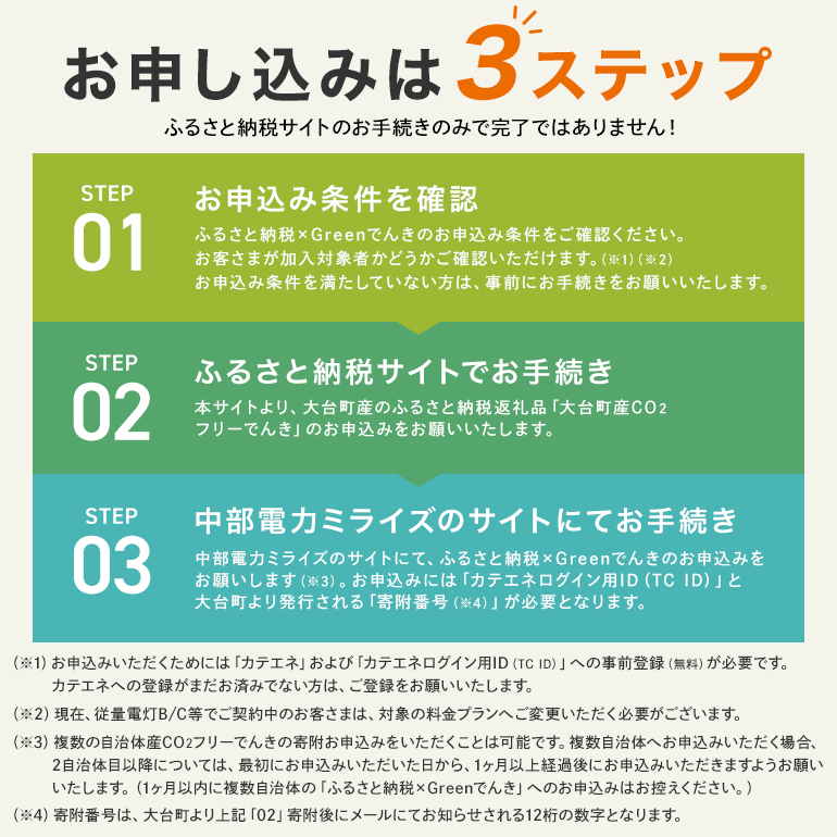 ふるさと納税寄附後、中部電力ミライズWEBサイト(ふるさと納税×Greenでんき)よりお手続きいただく必要がございます。なお、上記のお申込みには、大台町より発行される「寄附番号」が必要となります。