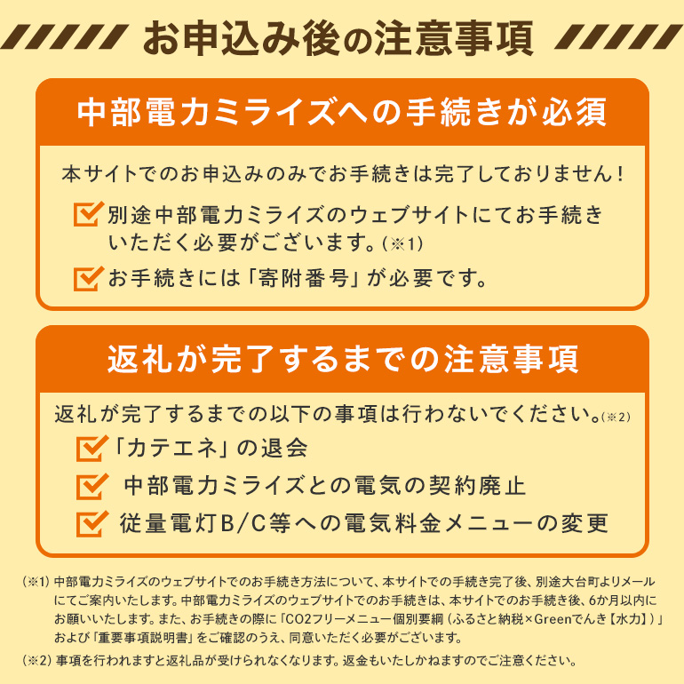 ・中部電力ミライズのウェブサイトにて専用メニューにお申込み手続きを実施いただいてから、返礼が完了するまでの間、以下の事項を行わないでください。