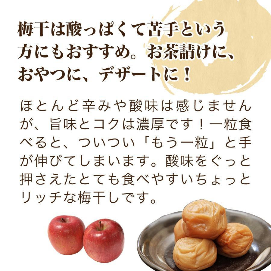 完熟梅の芳醇な甘さにたっぷりのはちみつを加え、りんご酢で後味すっきりに仕上げました。フルーツ感覚でお茶うけにも!