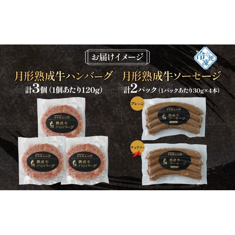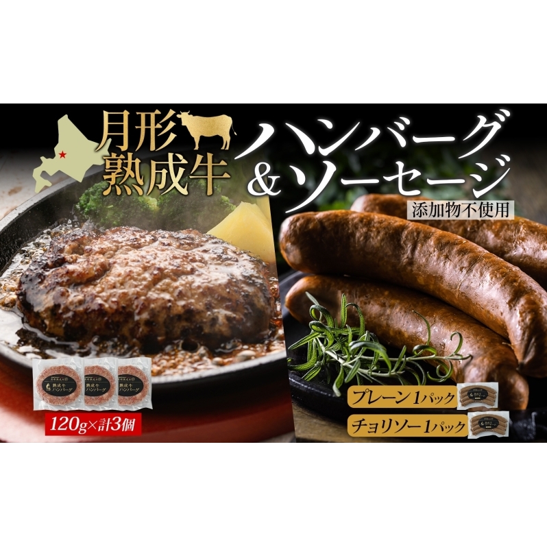 月形熟成牛 ハンバーグ 120g × 3個 ソーセージ プレーン チョリソー 30g × 4本 各1パック 計480g 添加物不使用 セット ブランド 高級 グルメ お取り寄せ 肉汁 焼肉 鉄板焼 ギフト 【 月形町 】