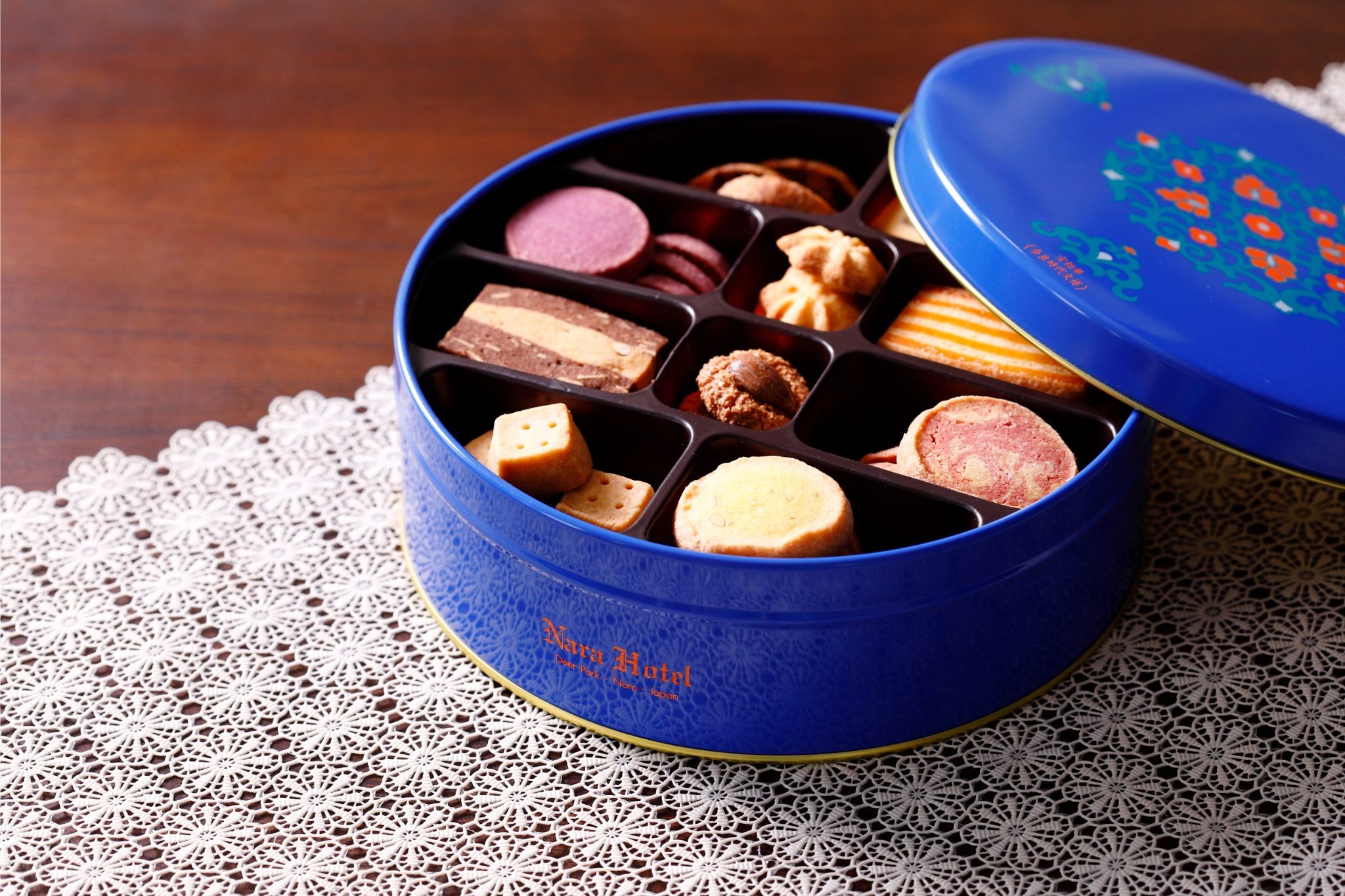 正倉院文様の宝相華がデザインされた缶の中に、10種のクッキーを詰め合わせました。