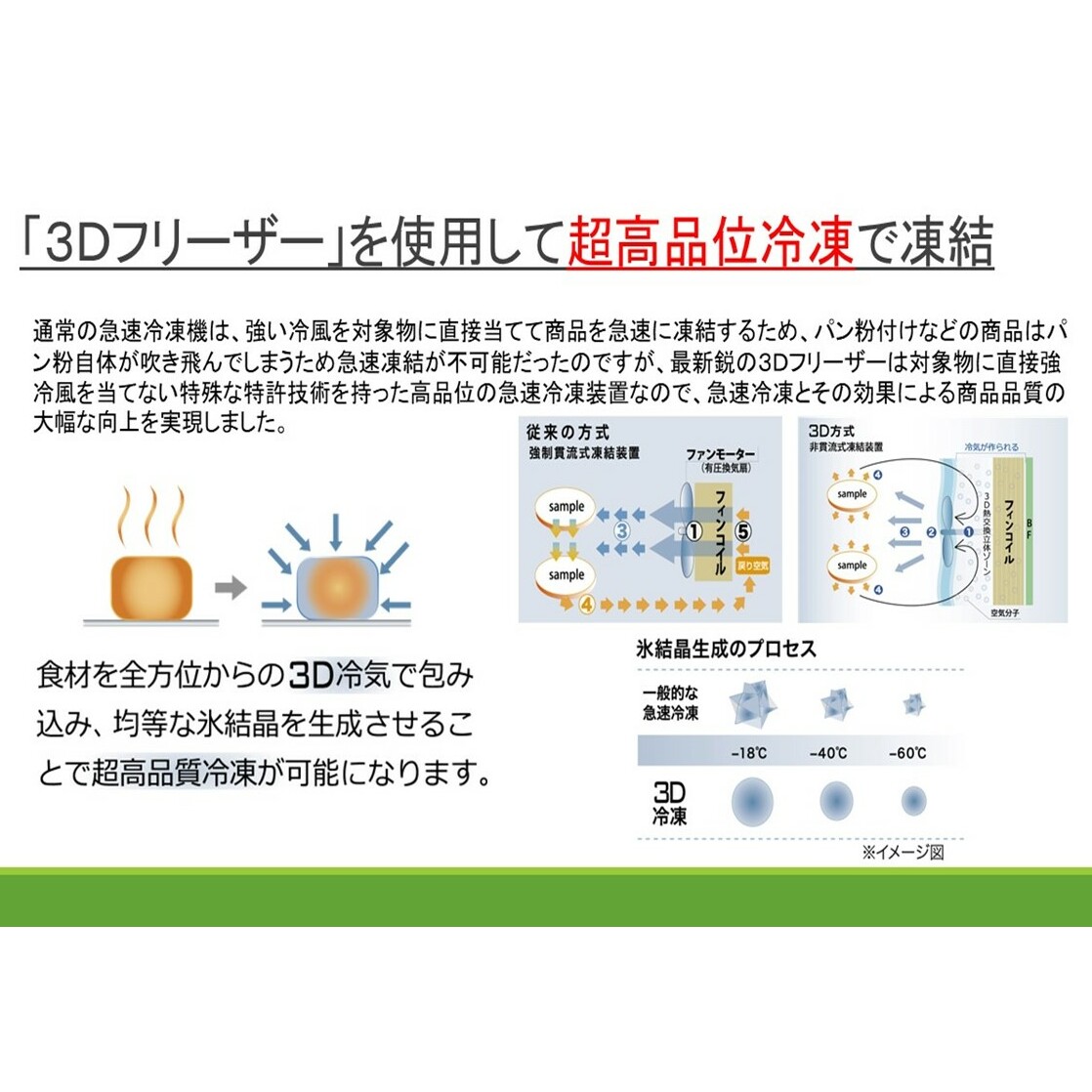 調理済みなので「冷凍のまま約15分湯せん」するだけで失敗知らず、簡単に専門店のようなデミグラスハンバーグをお楽しみいただけます。又、本商品は作りたての美味・食感・鮮度を維持するために最新鋭の冷凍機「3Dフリーザー」を使用し急速凍結していますので、出来たてそのままのおいしさをご堪能いただけます。