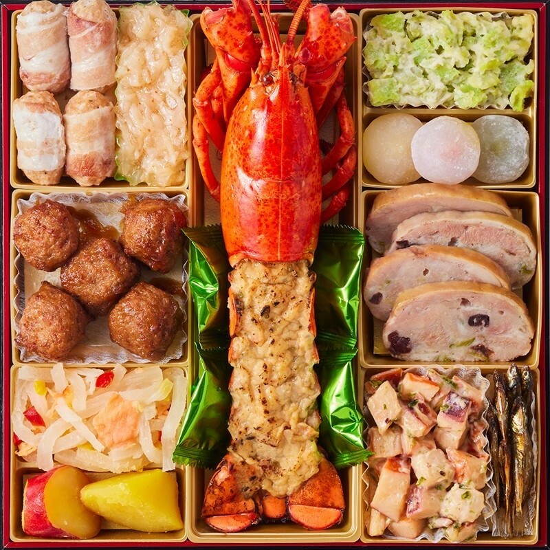 特大重箱に盛り付けたおせちは圧倒的ボリューム!シェフ自慢の「オマール海老のグラタン」は絶品!「雑煮出汁」までついたお正月を鮮やかに彩るワンランク上の逸品