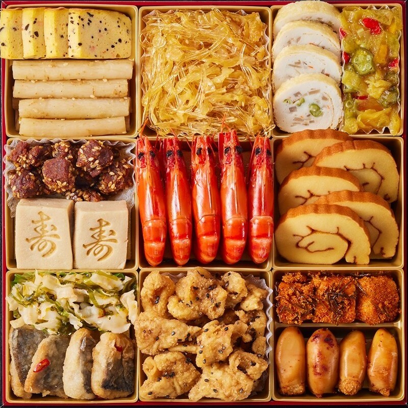 やわらか福さ焼き4枚、たたきごぼう50g、ふかひれ風中華くらげ70g、味付信田巻4枚、彩り柚子くらげ40g、まぐろ角煮の金胡麻和え40g、寿高野豆腐2個、有頭海老の艶煮5尾、伊達巻5枚、帆立貝黄金30g、鶏皮から揚げ45g、真だら子昆布煮45g、にしんの黒酢南蛮4個、味付子持イカ4個