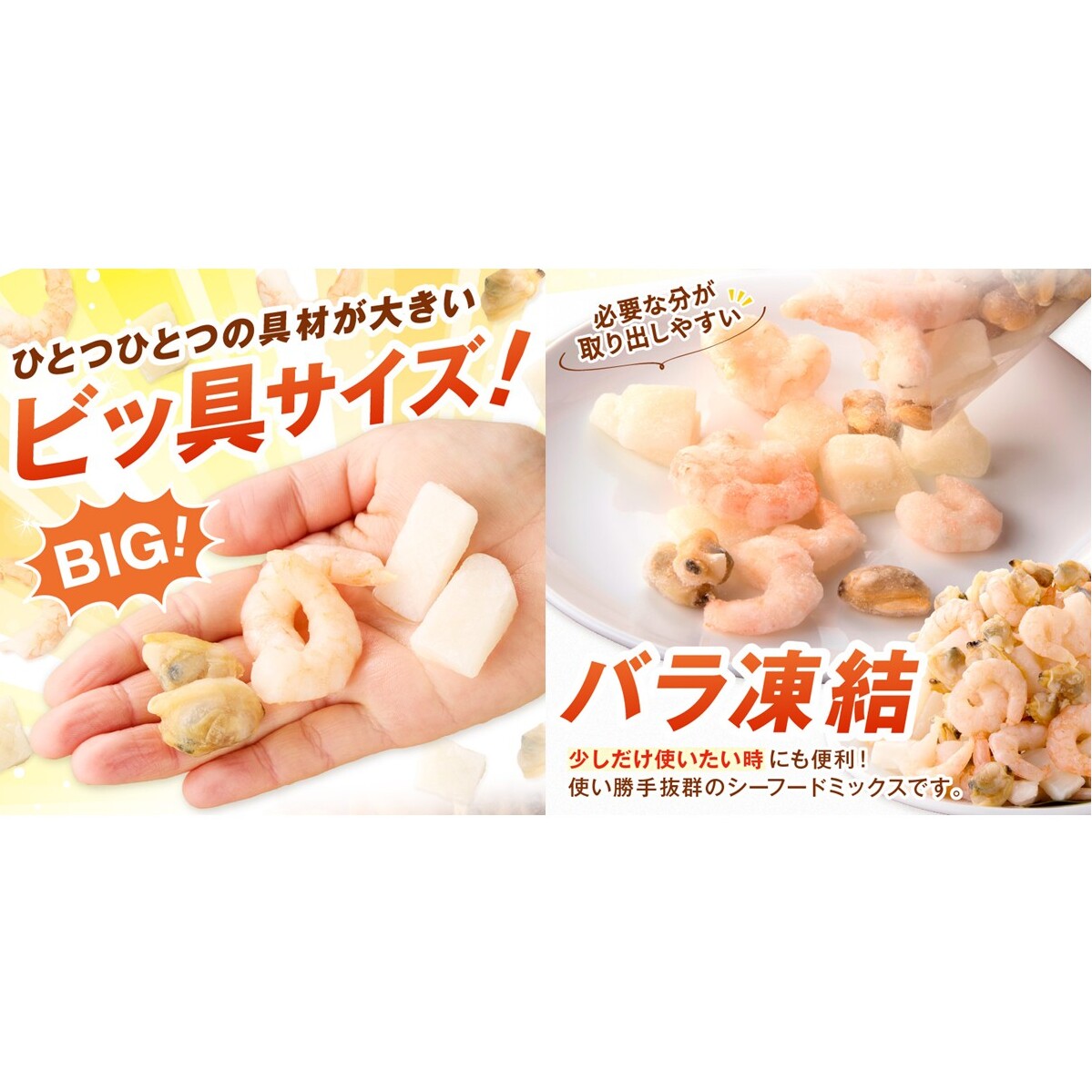 【ビッ具】と表すように大きめの具材が入っており、中華丼・チャーハン・シーフードカレー・お好み焼きの具・パスタなど幅広い用途で活躍します。