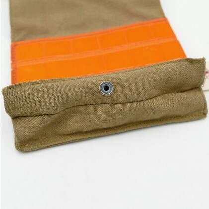勇敢な消防士が実際に火事や災害の現場で着用する消防服は安全面から10年足らずで着用期限を迎えます。そこでSDGsの考えに基づき着用期限を迎えた高梁市の消防服をバッグにリメイクしました。難燃性と耐水性に優れている消防服の特性を活かし、高梁市内で天満屋ハートネットの従業員の手で丁寧に製作した一品です。シンプルかつ機能的なバッグは持つ人の年齢や性別を選びません。ジャケット左胸ポケットを使用しています。底にある穴は水抜きです。