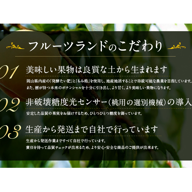 岡山県内多くの場所で栽培されている清水白桃ですが、フルーツランド岡山では実際に栽培を行っているからこそできる一貫した栽培体制・商品管理体制と長年の試行錯誤で培った目利きでこだわりを詰め込んだ「本物の味」を皆様へお届けさせていただきます!