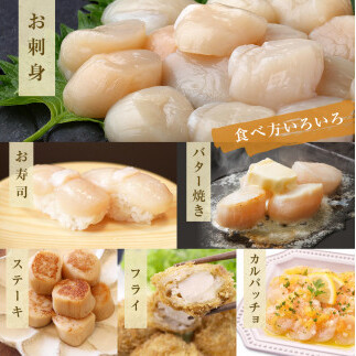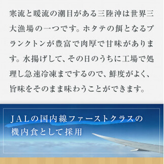 寒流と暖流の潮目がある三陸沖は世界三大漁場の一つです。ホタテの餌となるプランクトンが豊富で肉厚で甘味があります。 (解凍方法)  自然解凍をお勧めします。調理する前日に冷凍庫から冷蔵庫に移し解凍させてください。  (食べ方)  お刺身、寿司ネタ、バター焼き、ステーキ、フライ、カルパッチョ等いろいろな用途で楽しめます。 【製法やこだわり】 水揚げして、その日のうちに工場で処理し急速冷凍までするので、鮮度がよく、旨味がそのまま味わうことができます。 【注意事項/その他】 ※数量限定となるため、定数になり次第締め切らせていただきます。あらかじめご了承ください。 【地場産品類型】 3:宮城県内で養殖された帆立を水揚げ後、石巻市内の工場に搬入し、帆立を剥き、冷凍、袋詰めする作業までの加工をすべて石巻市内で行う。