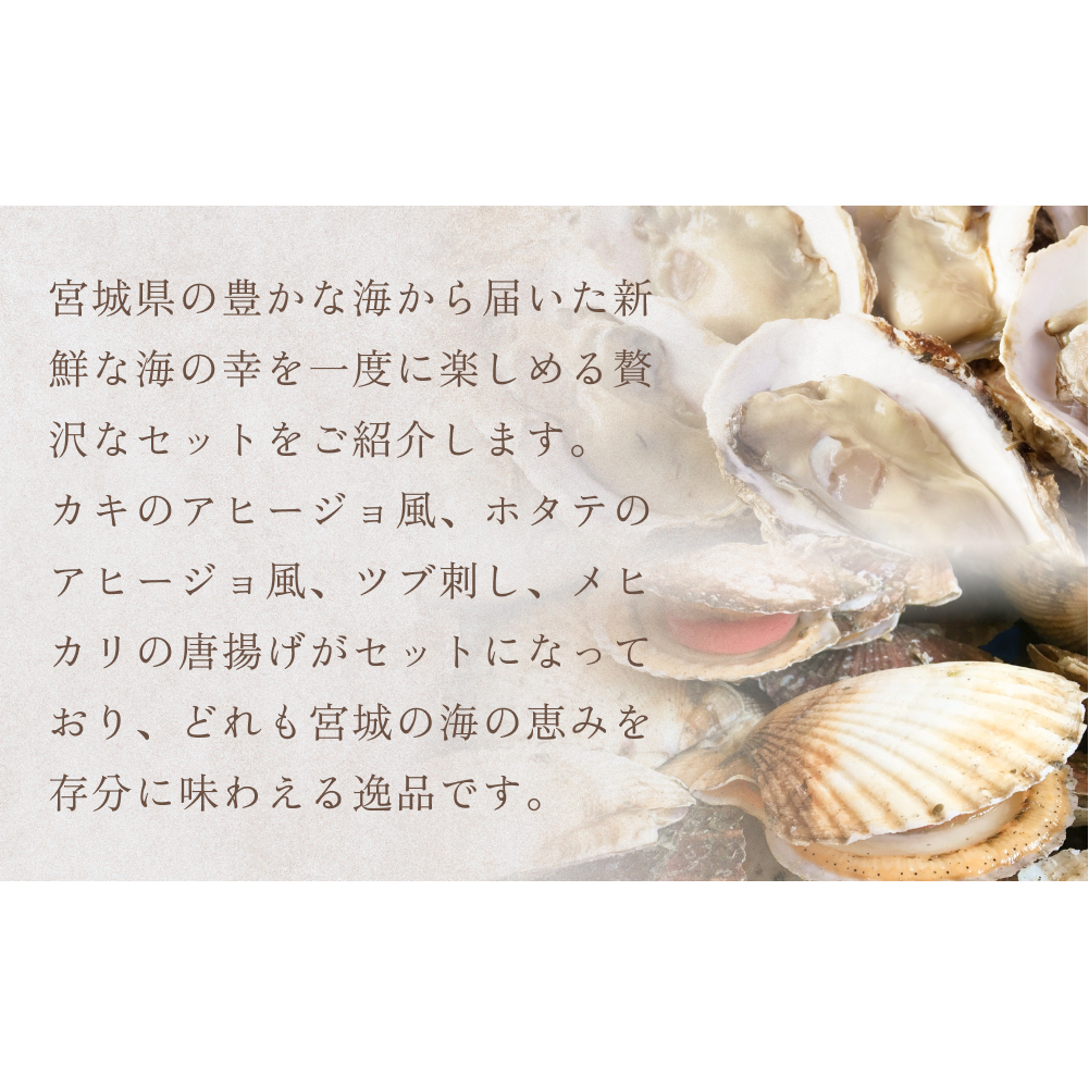 宮城県の豊かな海から届いた新鮮な海の幸を一度に楽しめる贅沢なセットをご紹介します。カキのアヒージョ風、ホタテのアヒージョ風、ツブ刺し、メヒカリの唐揚げがセットになっており、どれも宮城の海の恵みを存分に味わえる逸品です。