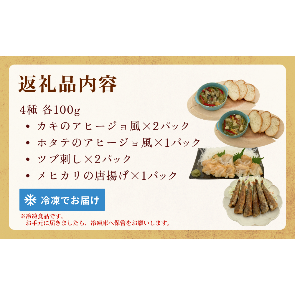 ■アヒージョ風:三陸産の新鮮な海の食材を急速冷凍。カキのアヒージョ風は生食用の牡蠣を使用しており、安心・安全をお届けします。ホタテのアヒージョ風は、新鮮な貝柱を使用し、旨味を損なわないように加工しております。■ツブ刺し:新鮮な生きている貝を加工後、急速冷凍しております。唾液腺もシッカリと取り除いているので、解凍後直ぐにお召し上がりいただけます。■メヒカリの唐揚げ:その日の水揚げ、その日の加工・製造をしているので、新鮮抜群です。
