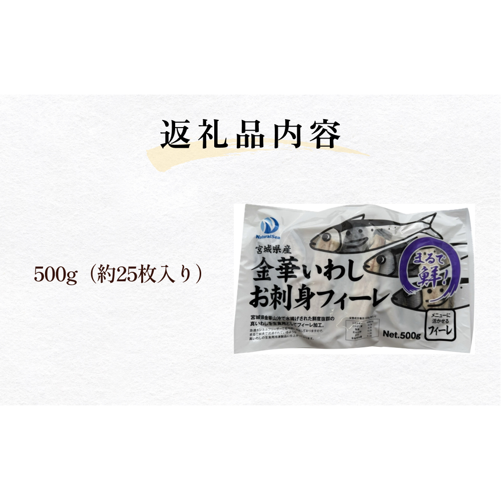 宮城県金華山沖で水揚げされた鮮度抜群で、脂乗りが良い時期に限定した約100g以上の大型真いわしを生食用フィーレ加工しております。製品完成まで1回凍結(急速トンネルフリーザー)しておりますので、まるで鮮魚で流通されているような生食用冷凍製品に仕上がっております。