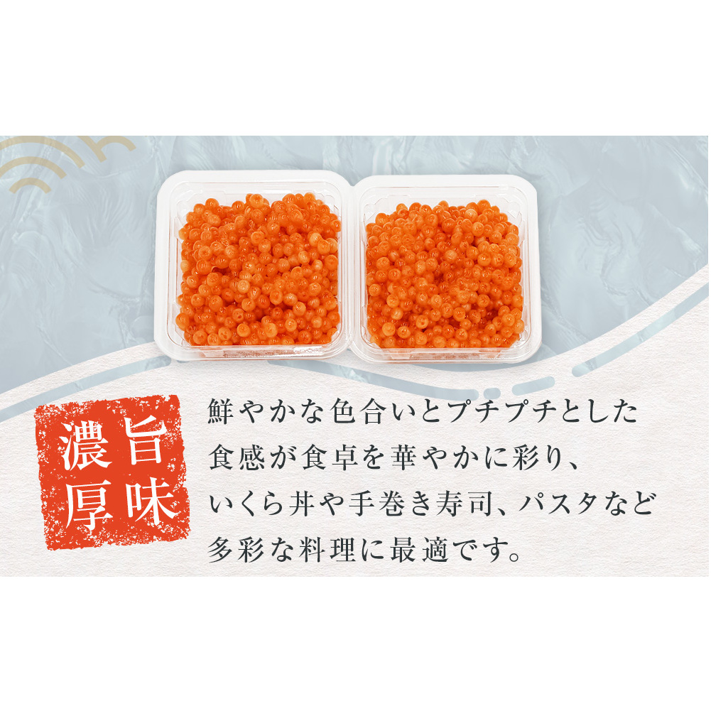 厳選された鮭卵を使用し、独自の調味液で丁寧に漬け込んだ逸品です。濃厚な甘みが特徴で、皮が薄いため口に残らず、滑らかな食感を楽しめます。鮮やかな色合いとプチプチとした食感が食卓を華やかに彩り、いくら丼や手巻き寿司、パスタなど多彩な料理に最適です。3D急速冷凍していますので、いつでも解凍してご賞味いただけます。
