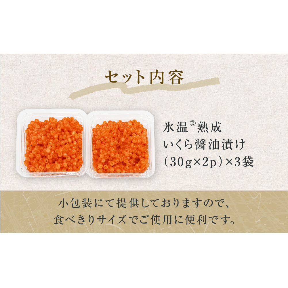 いくら 醤油漬け ( 30g×2p ) × 3袋 合計180g 氷温熟成 鮭 イクラ 醤油漬 魚卵 小分け 冷凍 サケ 海鮮 魚介 魚 漬け 丼 鮭子 鮭卵 いくら醤油 プチプチ 熟成 濃厚 イクラ醤油 お取り寄せ 宮城県 石巻市 まるたか水産