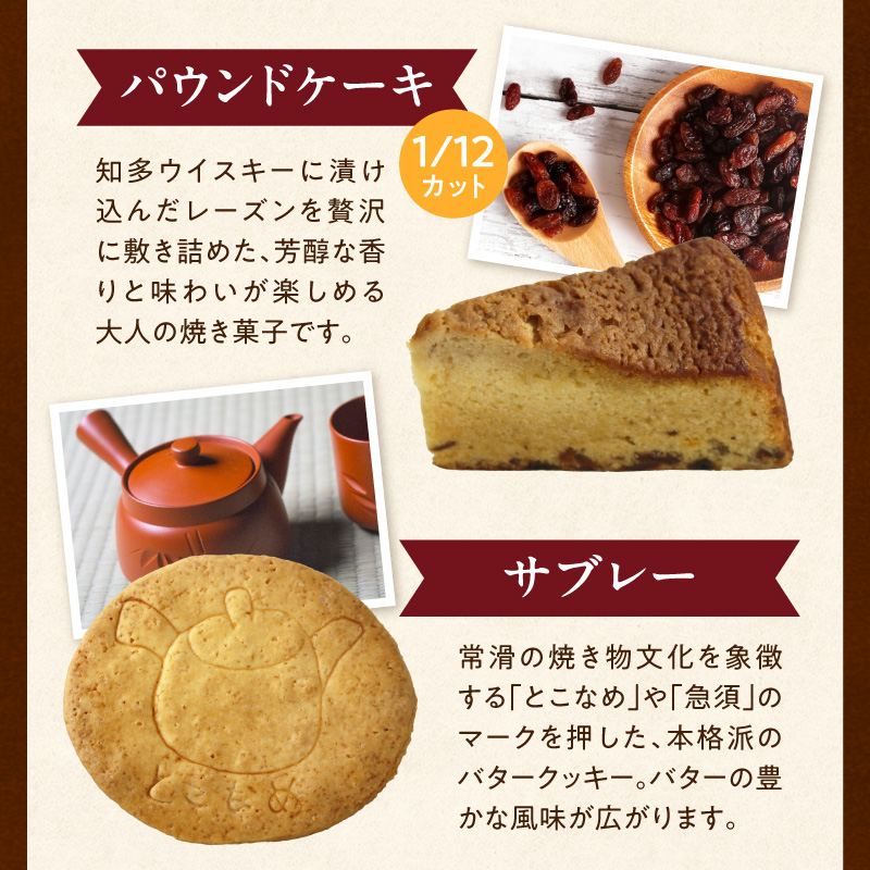 知多ウイスキーに漬け込んだレーズンを贅沢に敷き詰めた、芳醇な香りと味わいが楽しめる大人の焼き菓子です。
