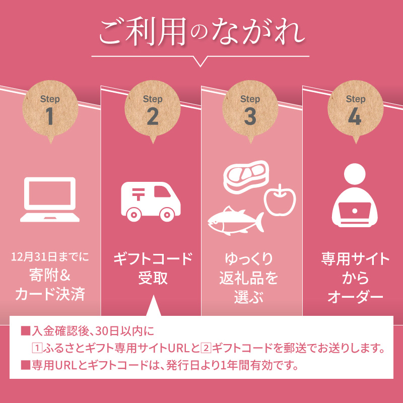 そんな方にぴったりな、寄附申込だけしておいて返礼品はあとから選べるギフト券をご用意しました!