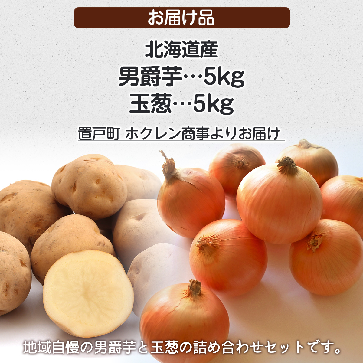 地域自慢の男爵芋と玉葱の各5kg、計10kgの詰め合わせセットです。