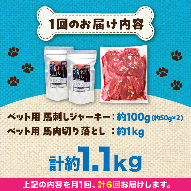 【全6回定期便】詰め合わせ 国内加工 ペット用 馬肉 切り落とし 約1kg ペット用 馬刺しジャーキー 約100g(約50g×2) / ペットフード ドッグフード 愛犬 馬肉【五右衛門フーズ】 [BHCY067]