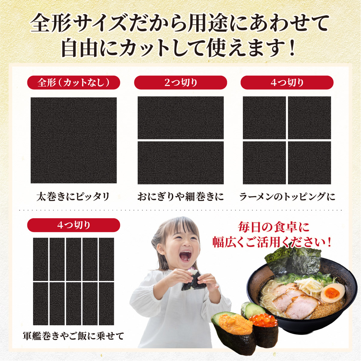 そのままパリッとおやつ感覚で、おにぎりや手巻き寿司、ラーメンやパスタのトッピングなど、毎日の食卓に幅広くご活用ください。