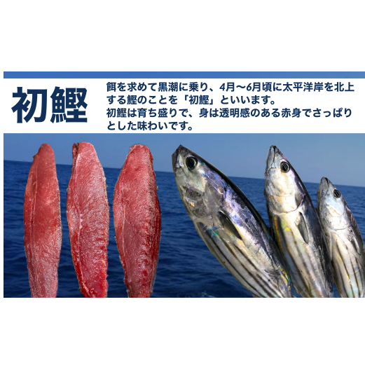 初鰹は、3月から6月の終わりごろまで土佐沖の黒潮を回遊しており、その時期に水揚げされた「鰹」を”初鰹”と呼びます。