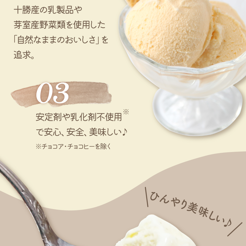 自家生産の健康な母牛から搾った新鮮な牛乳をたっぷり使い、地元の新鮮な野菜、豆類などの素材と十勝産の生クリーム、脱脂粉乳、甘味料にこだわり、安定剤を使わずに、酪農家の母ちゃんが愛情こめて作りました。