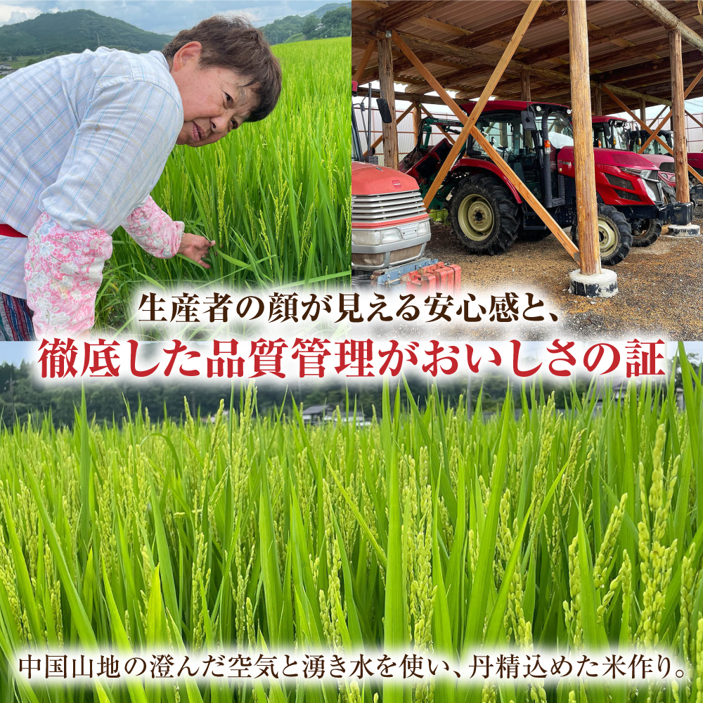 中国山地の澄んだ空気と湧き水を使い、丹精込めて米作りを行っています。