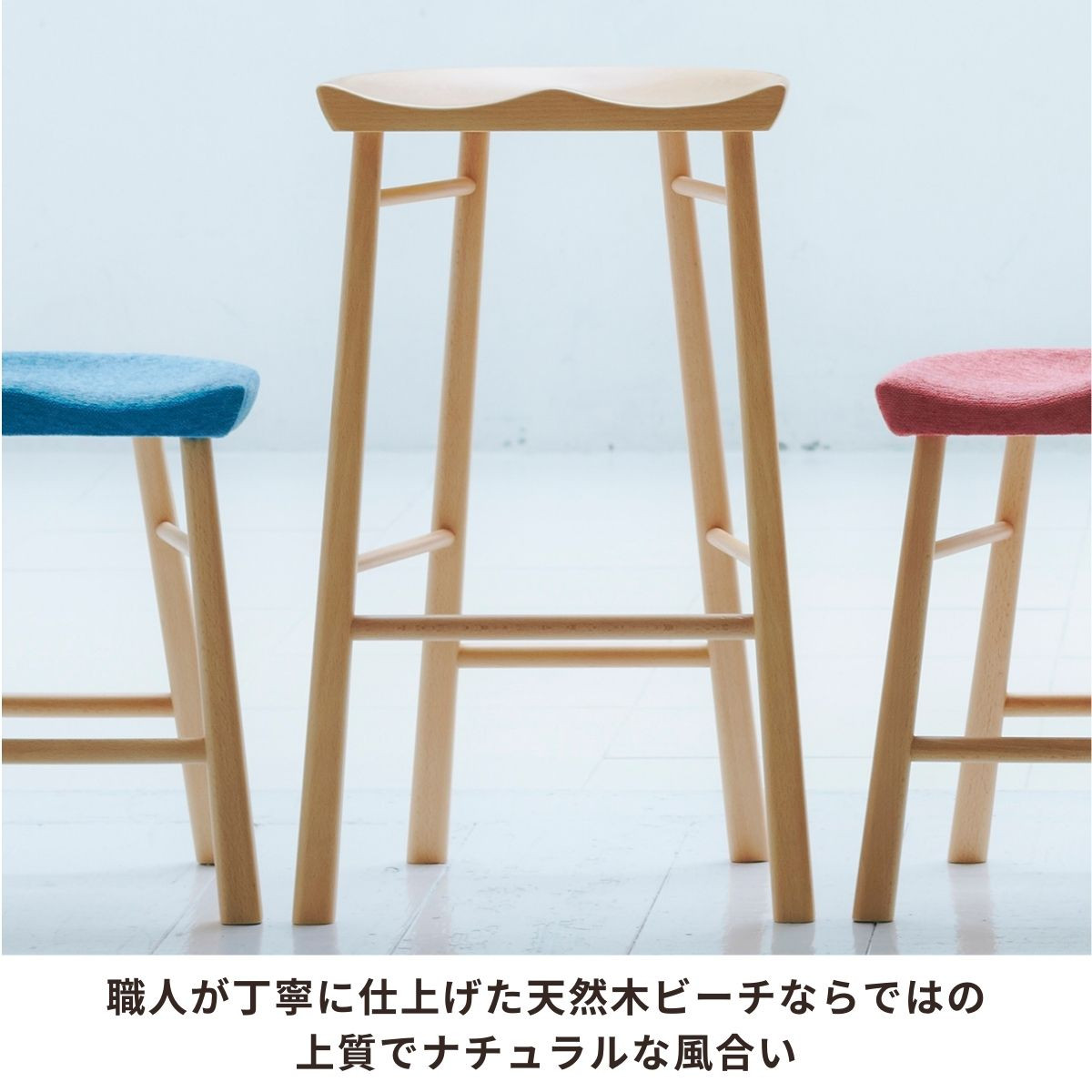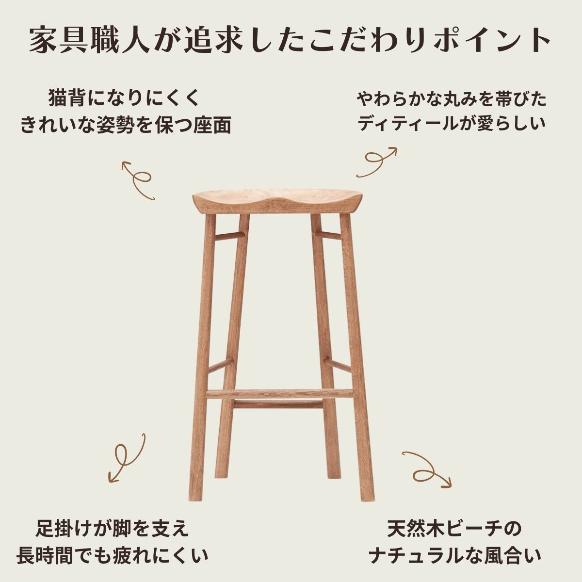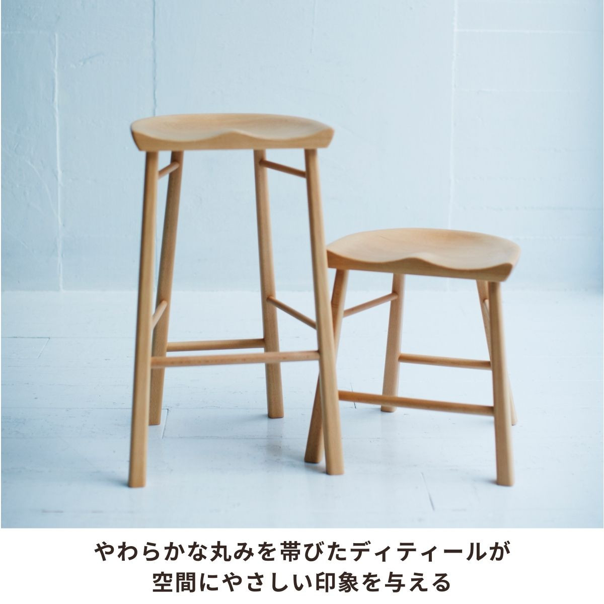 丸みを帯びたディティールで可愛らしいフォルム。座面はビーチ無垢材をお尻にフィットする形状に削り出し、背もたれが無くても安定感のある座り心地。丸みのあるフォルムに、天然木を贅沢につかったクラフト感溢れるデザイン。素朴な佇まいで、ビーチ天然木の風合いを感じる手触りも良いハイスツールです。