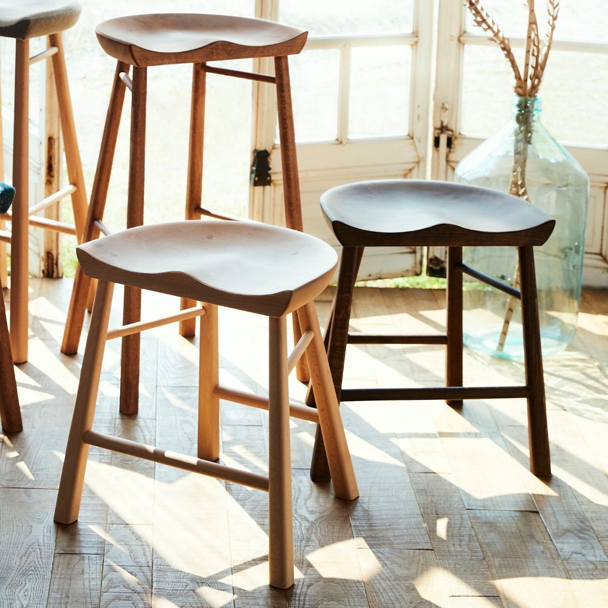 丸みを帯びたディティールで可愛らしいフォルム。座面はビーチ無垢材をお尻にフィットする形状に削り出し、背もたれが無くても安定感のある座り心地。丸みのあるフォルムに、天然木を贅沢につかったクラフト感溢れるデザイン。素朴な佇まいで、ビーチ天然木の風合いを感じる手触りも良いキッチンスツールです。