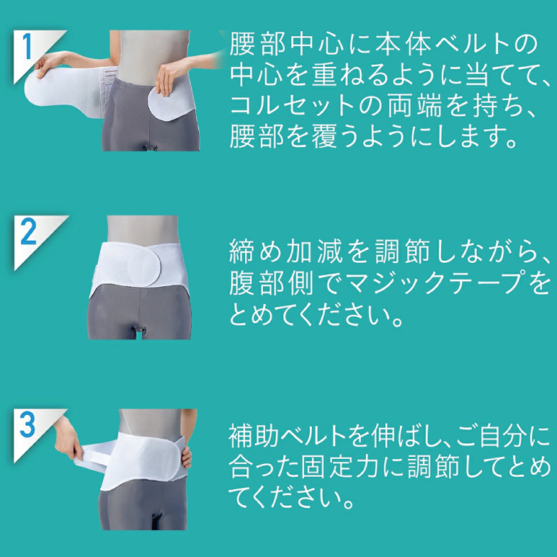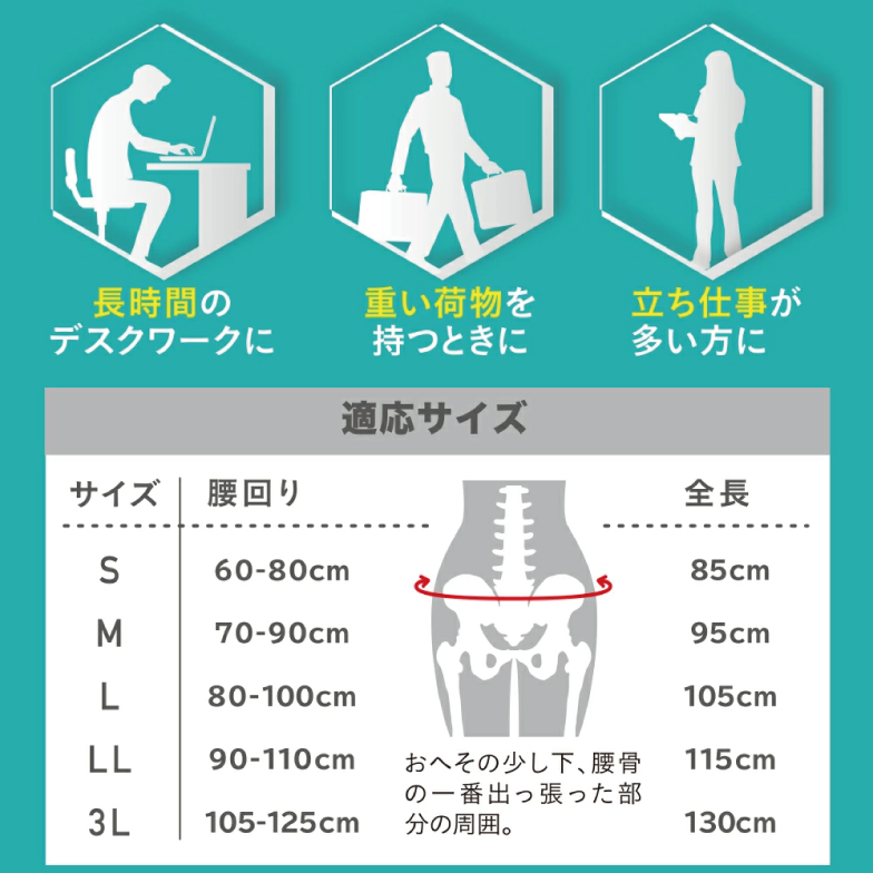 伸縮性の高い補助ベルトで腰を強力に支える、気になる腰部をしっかり固定する腰部幅(縦幅)20cmの腰用コルセット。ロングセラー製品です。