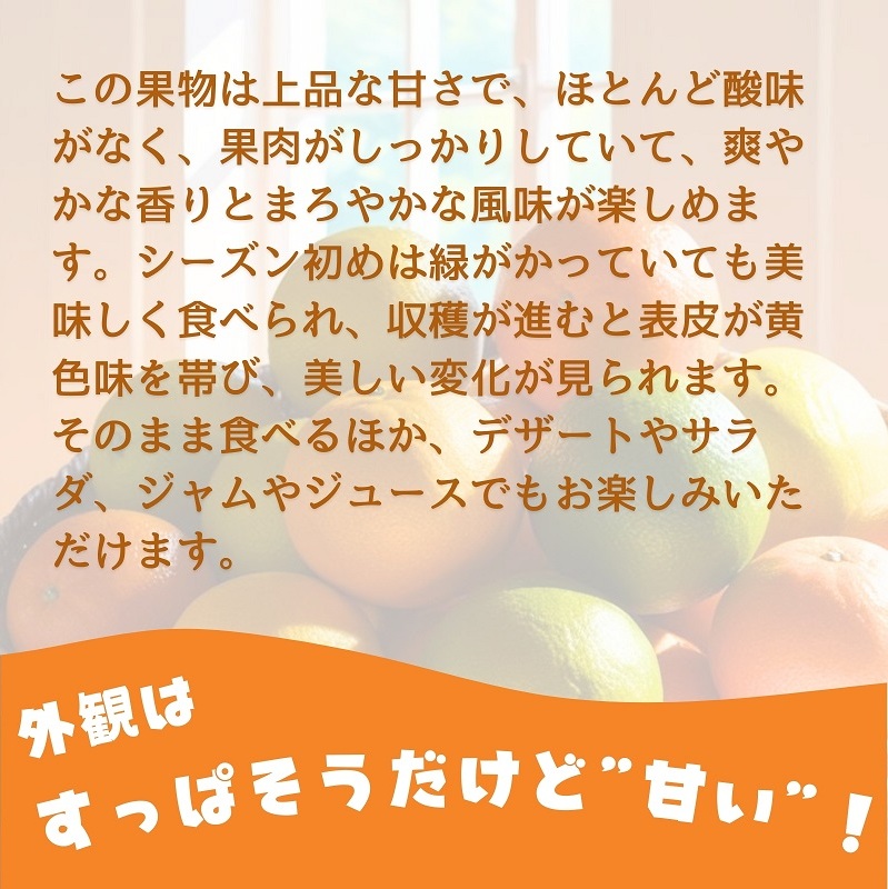 上品な甘さで酸味はほとんどありません。さわやかな香りとまろやかな風味が楽しめます。シーズン初めは写真のように表皮が緑がかっていますが、この状態で召し上がって頂いてもおいしく召し上がれます。
