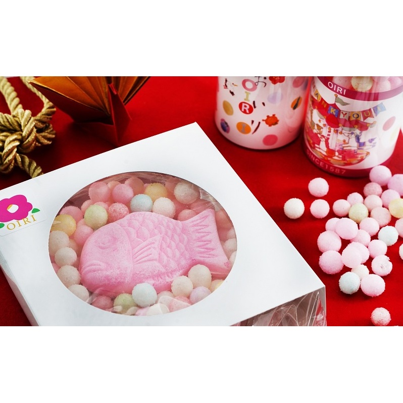 ・「白わくおいりと鯛」1個(角容器に鯛を模った米菓子とおいりの詰合せ)、