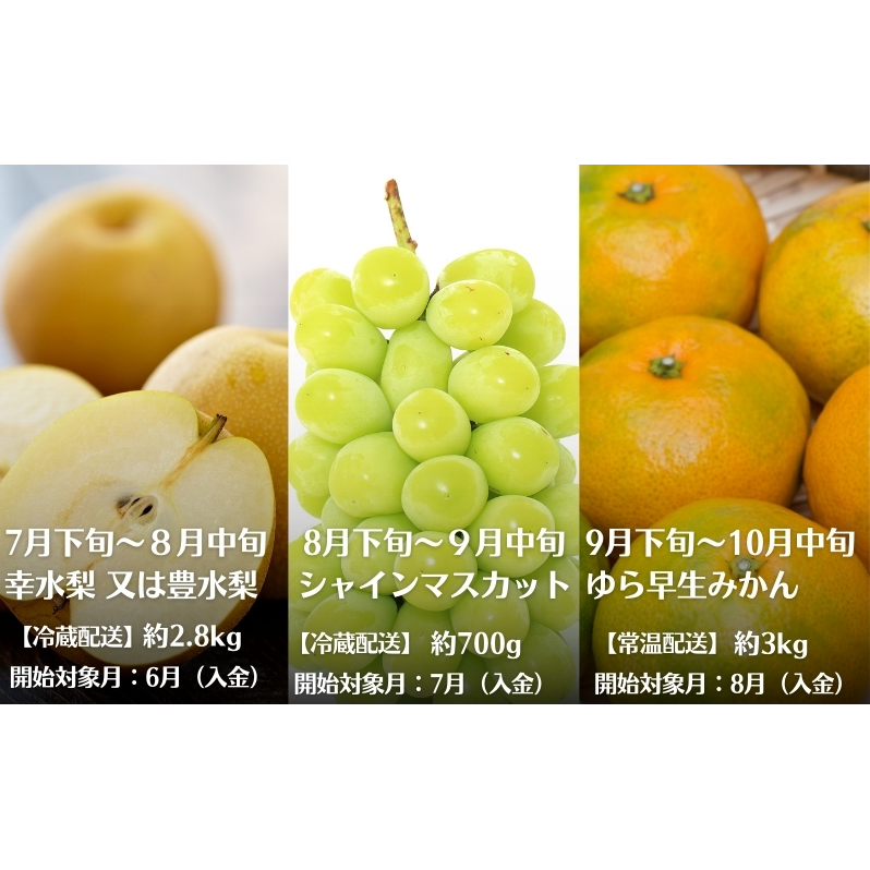 ※お届けは果実の生育状況等により前後する事があります。また、天候等の影響により予定しております果実が大幅な不作となった場合は他の果実へ変更させて頂く事がございますのでご了承願います。