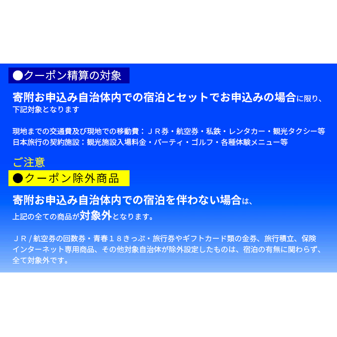 ■当クーポンは観音寺市内の宿泊施設に宿泊する旅行をお申し込みの場合に限り、ご旅行の精算にご利用いただけます。なお、合わせて観音寺市外の宿泊施設の予約を承ることも可能ですが、観音寺市外の宿泊代金の精算に当クーポンをご利用いただくことはできません。