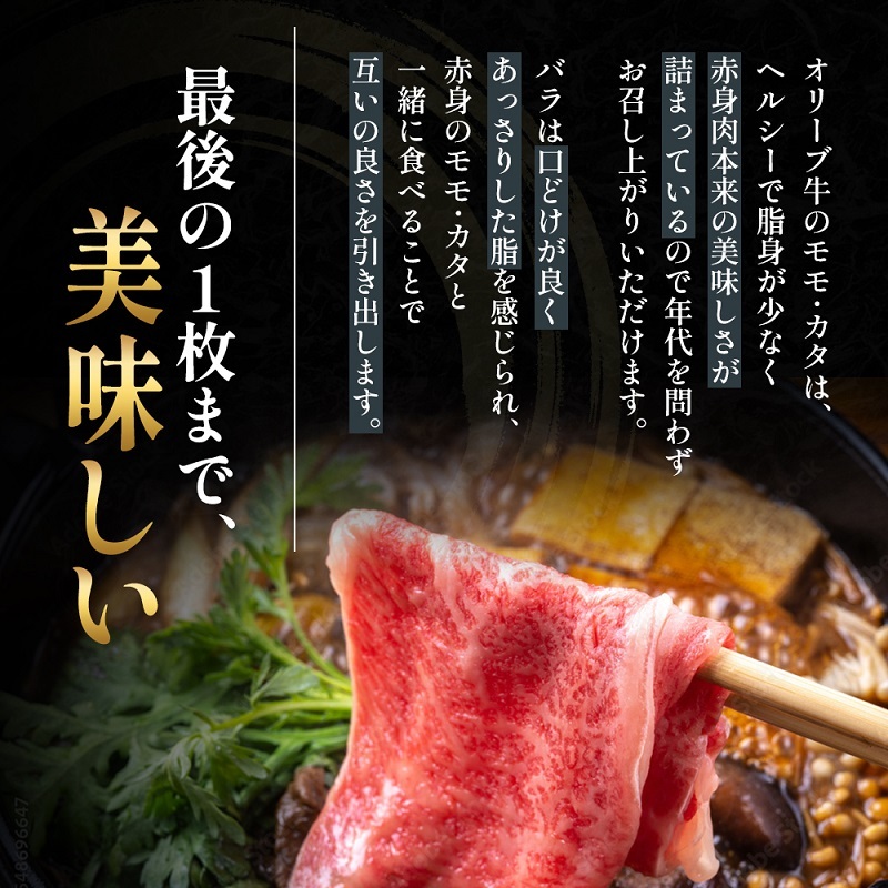 オリーブ牛の中でも美味しいと評判の赤身のモモ・カタ肉と、甘い脂身を楽しめるバラ肉を使用します。オリーブ牛の美味しさを楽しめるすき焼き肉です。
