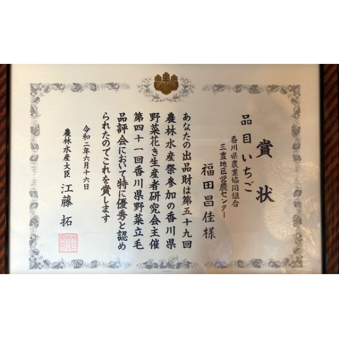 福田農園の苺は第41回香川県野菜立毛品評会にて[農林水産大臣賞]に輝きました。