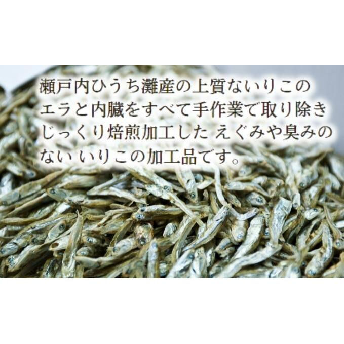 瀬戸内燧灘産の上質ないりこのエラと内臓をすべて手作業で取り除き、じっくり焙煎加工した、えぐみや臭みのないいりこの加工品です。小さなお子様からお年寄りまでおやつ感覚で召し上がっていただけるパリパリ焙煎いりこ、えぐみや臭みのないおだしが挽けるだしパック、手軽に使えるいりこの焙煎粉もセットにしました。瀬戸内燧灘産のいりこのうまみをお召し上がりください。