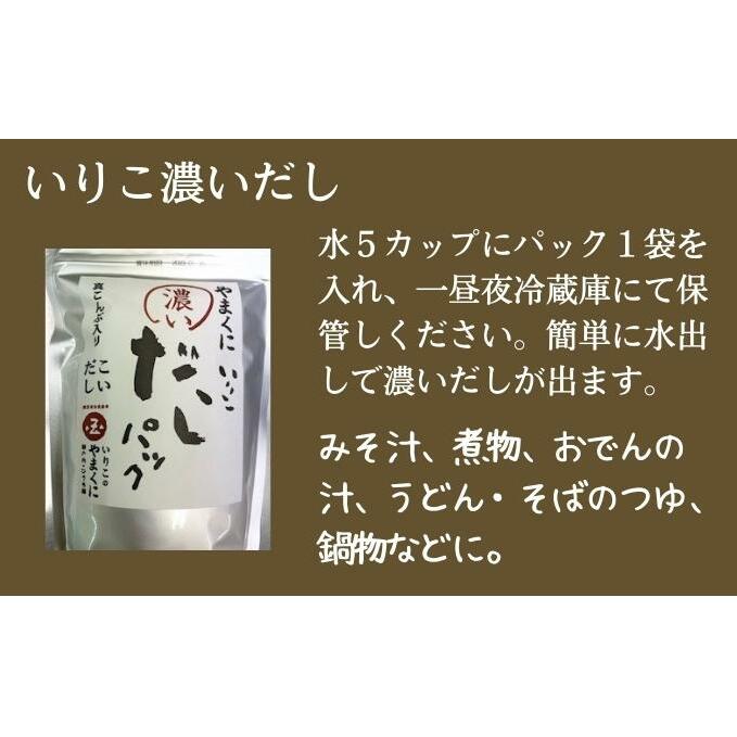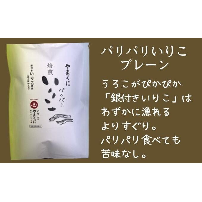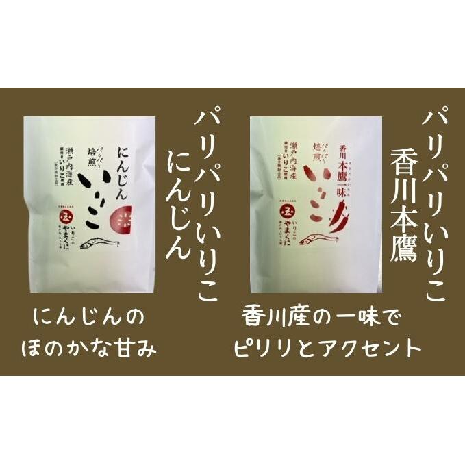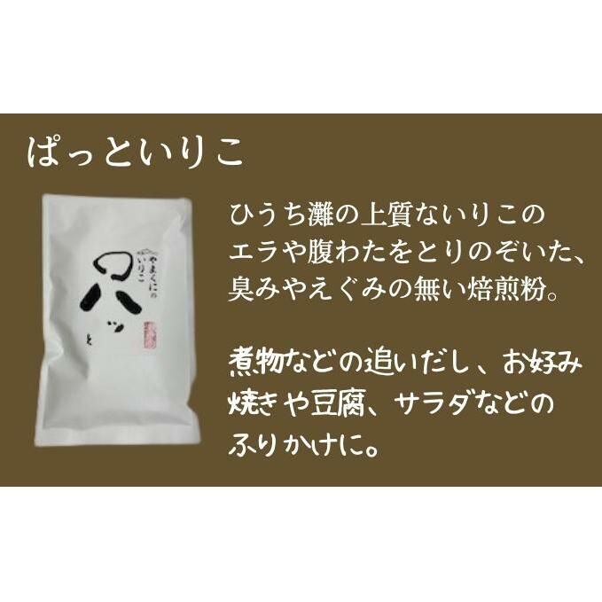 パリパリ焙煎いりこプレーン30g×1袋、黒パリパリ30g×1袋、パリパリ焙煎いりこ山椒30g×1袋、パリパリ焙煎いりこ香川本鷹一味30g×1袋、パリパリ焙煎いりこにんじん30g×1袋、やまくにいりこ濃いだし(10g×15袋)1袋、ぱっといりこ100g×1袋