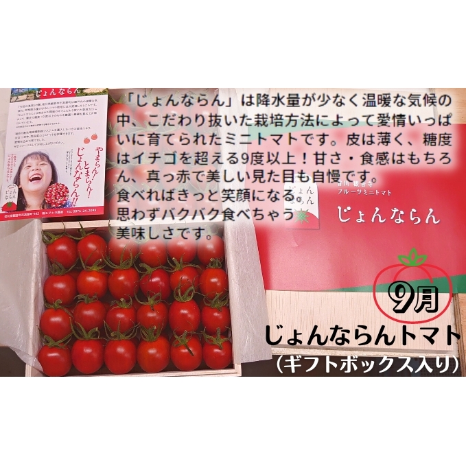 【9月】「じょんならん」は降水量が少なく温暖な気候の中、こだわり抜いた栽培方法によって愛情いっぱいに育てられたミニトマトです。薄皮でイチゴを超える糖度9度以上を実現しました。是非ご賞味ください。