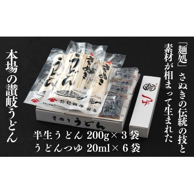 明治44年創業、地元観音寺で100年以上営業してきた紀州屋による、讃岐うどんのセットです。半生うどんは、生うどんを少し乾燥させ、賞味期限を長くしつつ、より生うどんに近い食感を残したものです。乾麺とは異なる食感、讃岐うどんならではの『コシ』を堪能いただけます。うどんのつゆ付です。