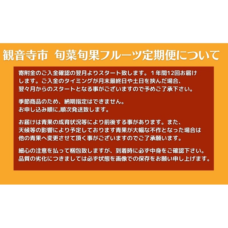 観音寺市で栽培されているみかん、シャインマスカットなど、四季に合わせた旬のフルーツと旬野菜を1年間少量ずつ楽しんでいただける定期便です。