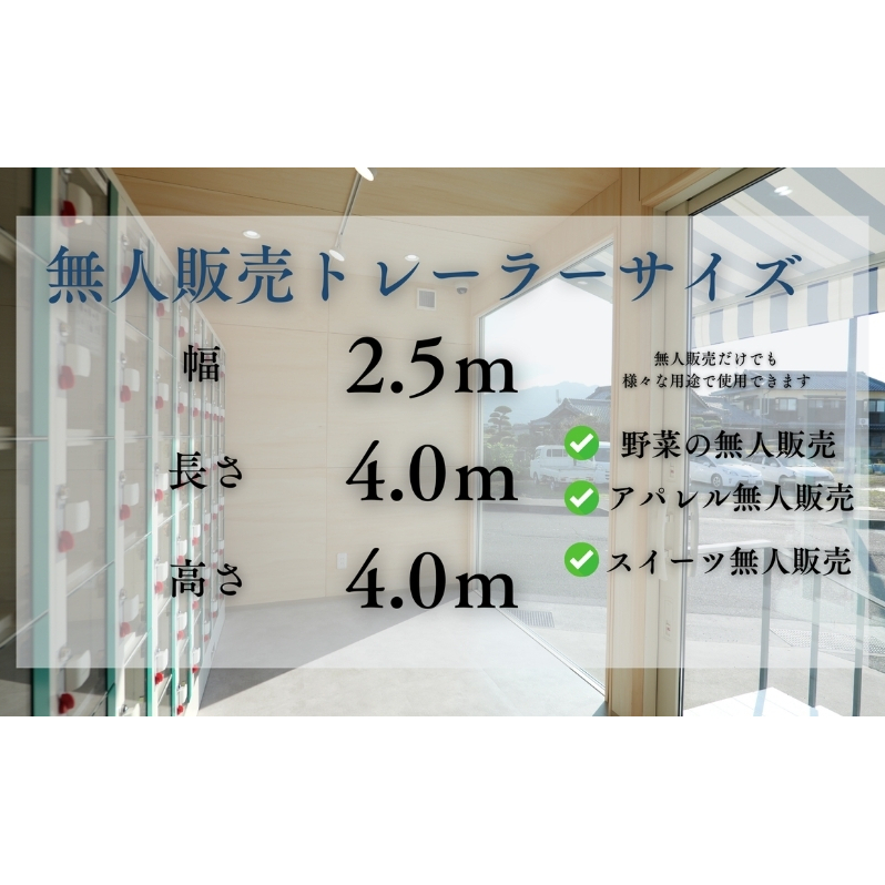 この4mのコンパクトなトレーラーハウスは、無人販売所としての活用に最適なサイズと機能性を備えた移動式ユニットです。
