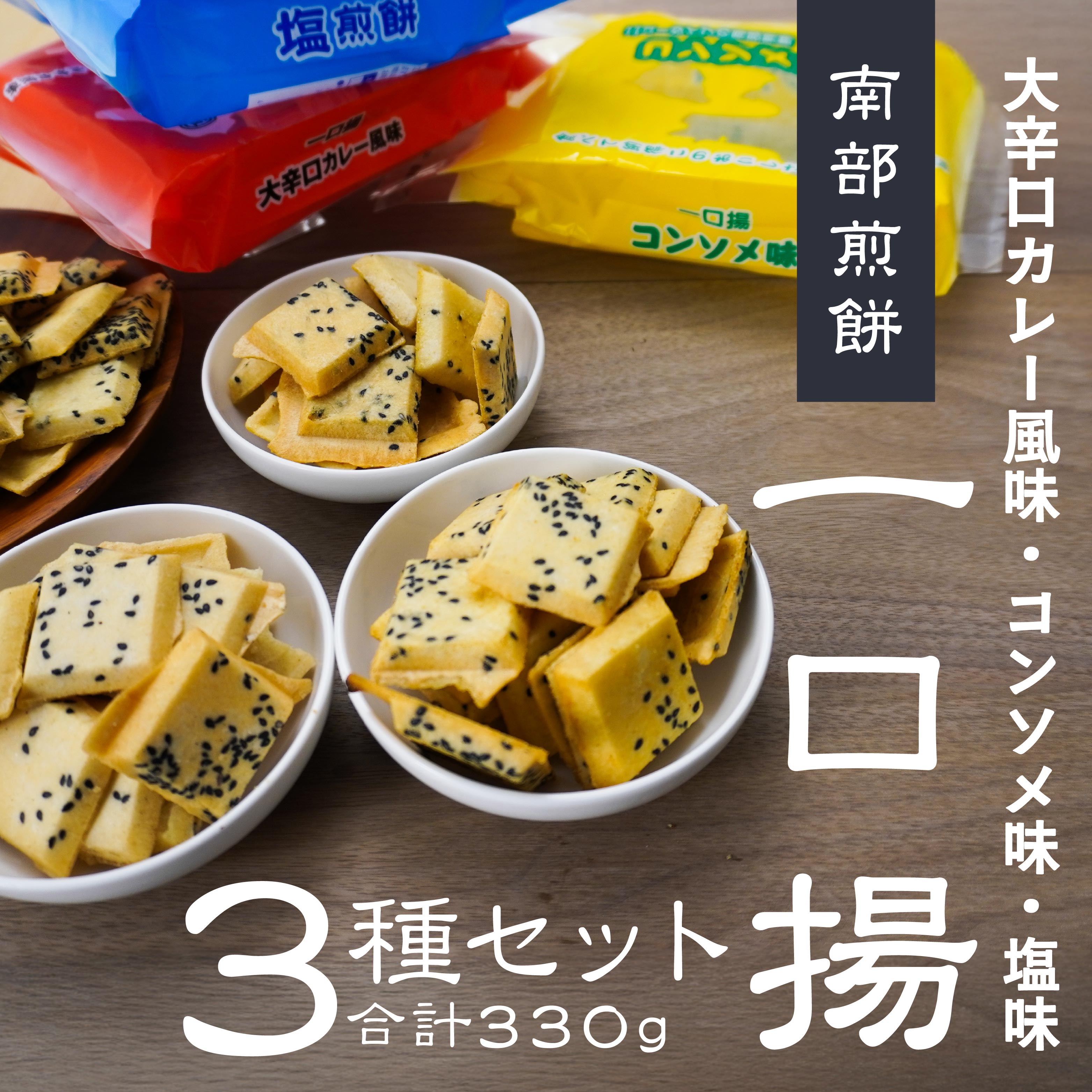 八戸市の老舗煎餅店「マルサカ煎餅」が手がけた、食べやすい一口サイズの揚げせんべいを3種類詰め合わせたセット