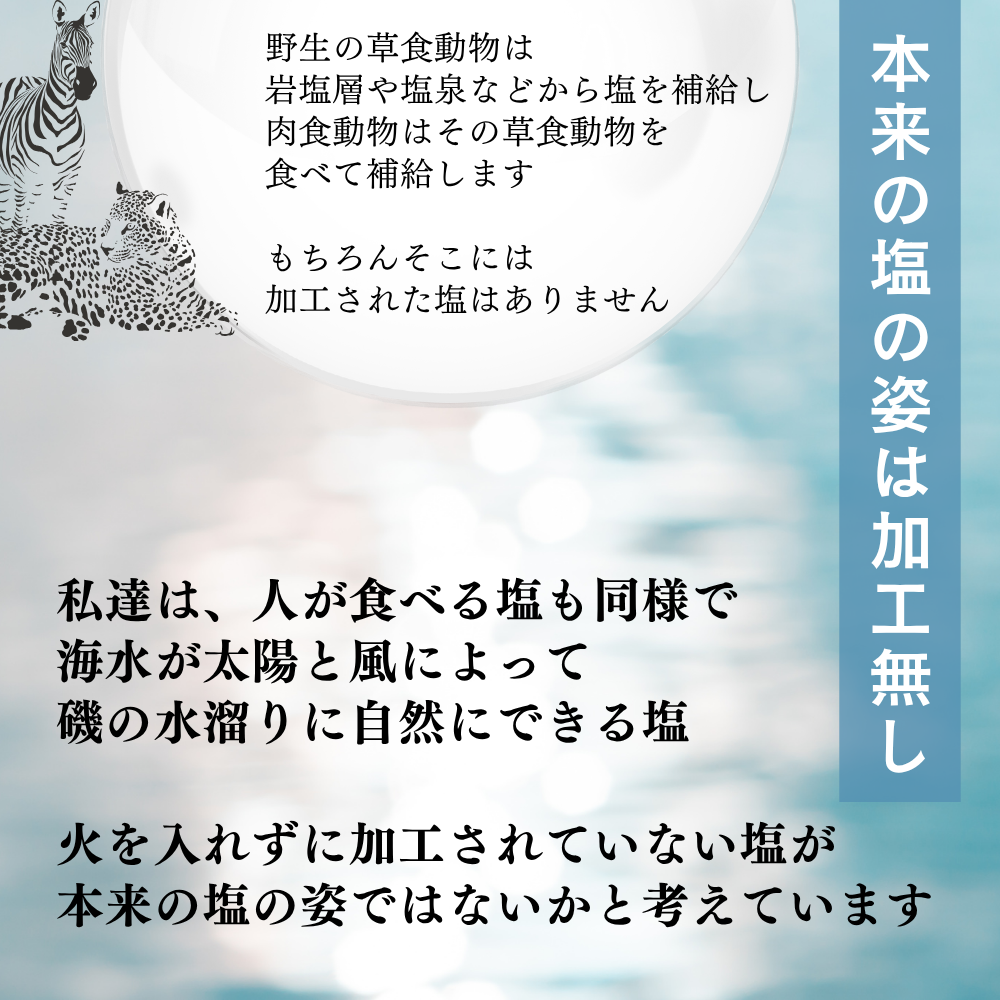 私達は、人が食べる塩も同様で、潮だまりに自然にできる、火を入れずに加工されていない塩が、本来の塩の姿ではないか、と考えています。
