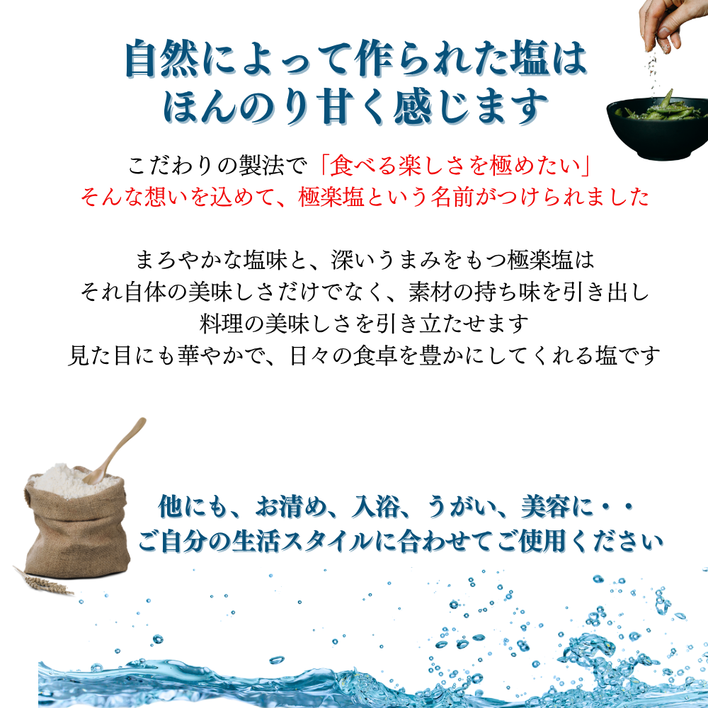 こだわりの製法で「食べる楽しさを極めたい」——そんな想いを込めて、極楽塩という名前がつけられました。まろやかな塩味と、深いうまみをもつ極楽塩は、それ自体の美味しさだけでなく、素材の持ち味を引き出し、料理の美味しさを引き立たせます。見た目にも華やかで、日々の食卓を少し豊かにしてくれる塩です。