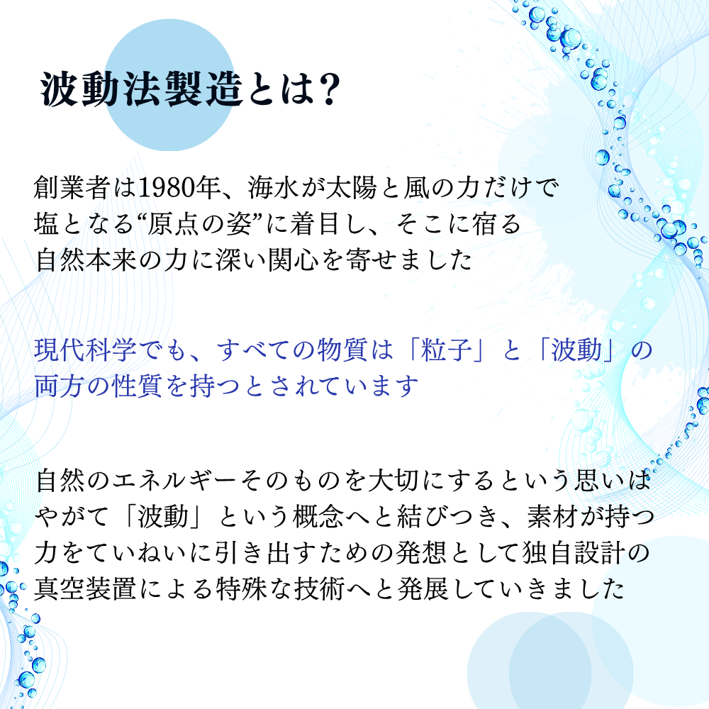 創業者は1980年、海水が太陽と風の力だけで塩となる“原点の姿”に着目し、そこに宿る自然本来の力に深い関心を寄せました。現代科学でも、すべての物質は「粒子」と「波動」の両方の性質を持つとされています。