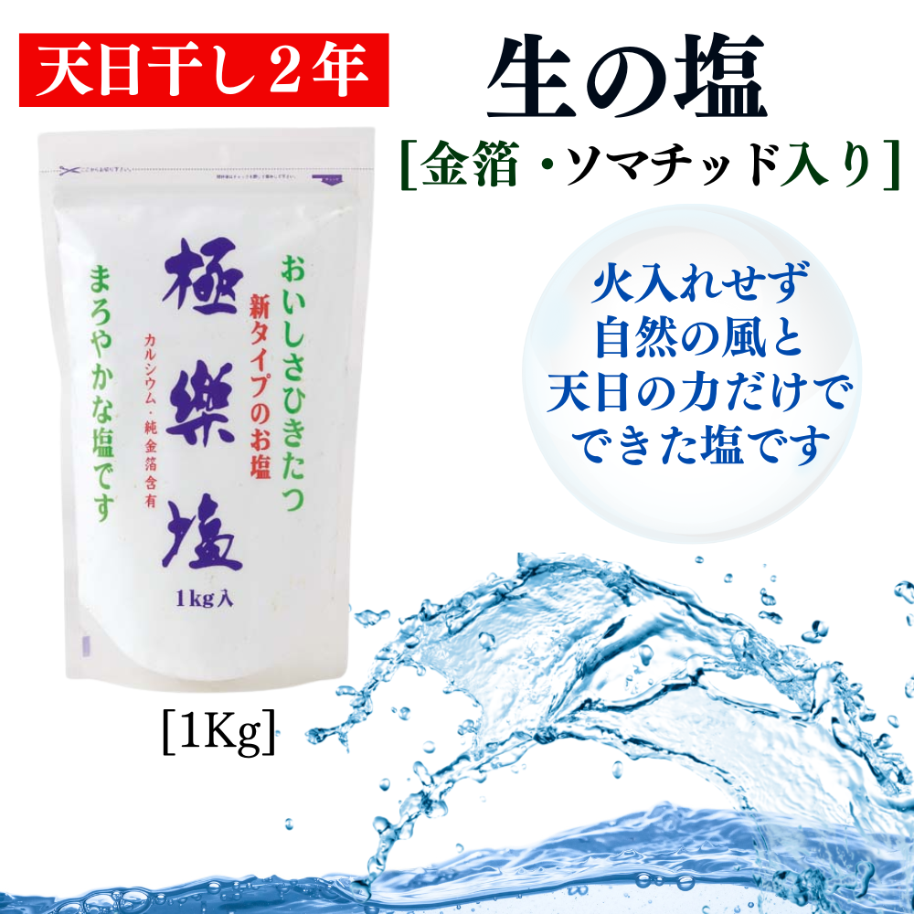 天日干し2年 火入れしない生の塩 「極楽塩」 1kg×1袋 金箔 貝カルシウム入り 食べる楽しさを極め こだわりの製法 塩 食塩 食卓塩 海塩 調味料 ミネラル ソルト
